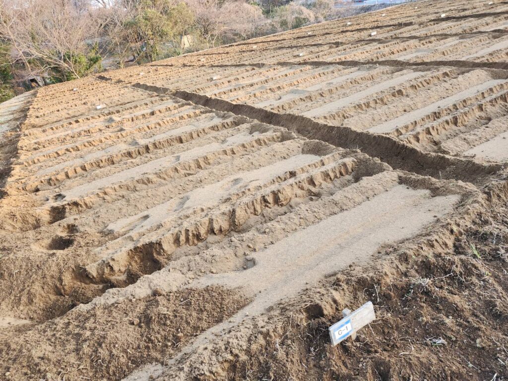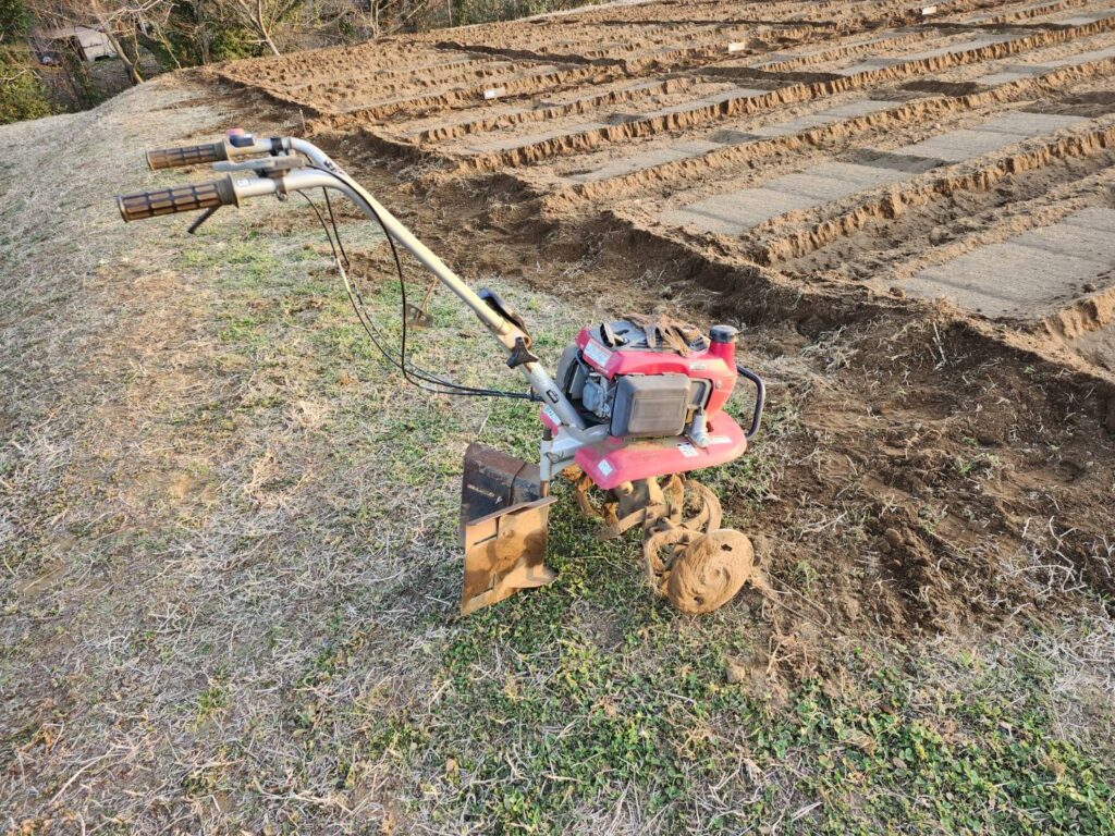 新シーズンの区画作り ブログ 2026.02.26 新シーズンに向けて畝を立てて区画作りを行いました。 測量して溝掘りしていきます。溝掘りに使うのがHONDAの「こまめ」です。軽くて使いやすいです。 一日がかりですが、なんとか区画を作ることができました(^^♪ 雅君はハウス前の草取りです。